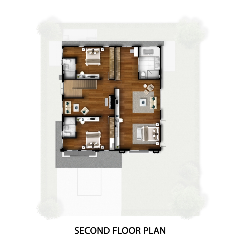 ส่วนพื้นชั้น 2 เป็นไม้ลามิเนตหนา 12 มม. โถงบันไดจะแจกไปที่ห้องนอนทั้งสามห้องที่มีห้องน้ำในตัว และที่โถงบันไดจะมีมุมอเนกประสงค์เหมาะใช้ทำที่นั่งพักผ่อนได้อีกจุด