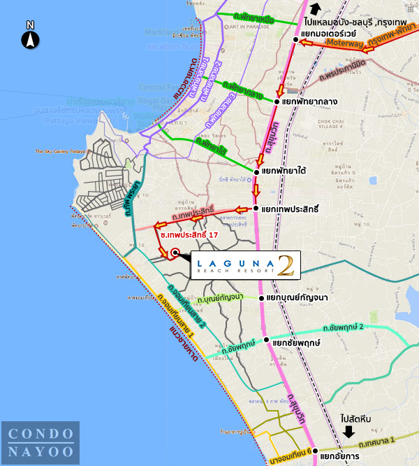 การเดินทางเริ่มจาก มอเตอร์เวย์ กรุงเทพ-พัทยา แยกมอเตอร์เวย์ ⇒ ถ.สุขุมวิท (ทล.3)  แยกเทพประสิทธิ์  ถ.เทพประสิทธิ์  ซ.เทพประสิทธิ์ 17 ขับตรงไปอีก 900 ม. ถึงโครงการ Laguna Beach Resort 2