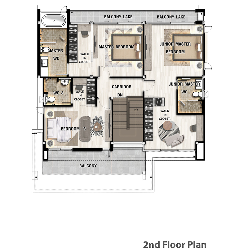 ไฮไลท์จะอยู่ที่ห้อง Master Bedroom และ Junior Master Bedroom ตำแหน่งห้องจะอยู่ฝั่งโซนหลังบ้านซึ่งจะได้วิวทะเลสาบ และสระว่ายน้ำที่ชั้นล่าง โดยเฉพาะ Master Bedroom จะพิเศษสุดคือห้องน้ำจะเชื่อมออกมาตรงระเบียง และเป็นส่วนของ Jacuzzi ที่ตั้งอยู่ตรงระเบียงด้านหลัง ได้อารมณ์เหมือนไปพักตามรีสอร์ต