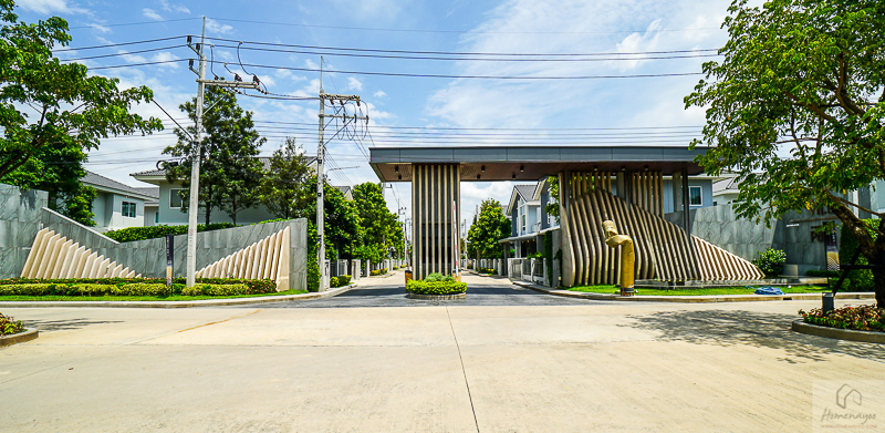 ด้านหน้าทางเข้าออก เลค วิลล่า @Lake Resort ราชพฤกษ์-ปทุมธานี มีซุ้มประตูแยกทางเข้าออก เป็นไม้กระดก เพิ่มความปลอดภัยให้กับลูกบ้านอีกชั้น