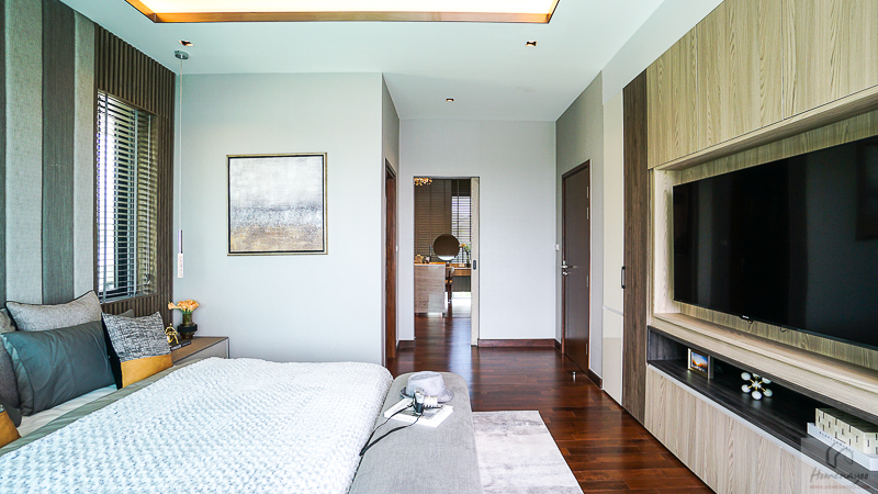 ระยะดูทีวีปลายเตียงค่อนข้างกว้าง ติดทีวีขนาดจอ 55-60 นิ้วได้ บ้านตัวอย่างกั้นผนังแยกเป็นส่วน Walk in closet ด้านหลัง ในสุดจะเป็นห้องน้ำ