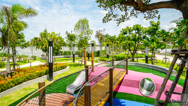 มีสวนมาให้หลายจุด ภายในสวนตกแต่งมาได้ร่มรื่น ออกแบบโดยสวนนงนุช ในสวนมีทั้งต้นไม้ใหญ่ ไม้พุ่ม และไม้ดอก มีสนามหญ้าโล่งๆไว้ทำกิจกรรต่างๆ พร้อมพื้นที่นั่งพักผ่อน และสนามเด็กเล่น อีกจุดเป็น Relaxing Pavilion ในสวนริมทะเลสาบ