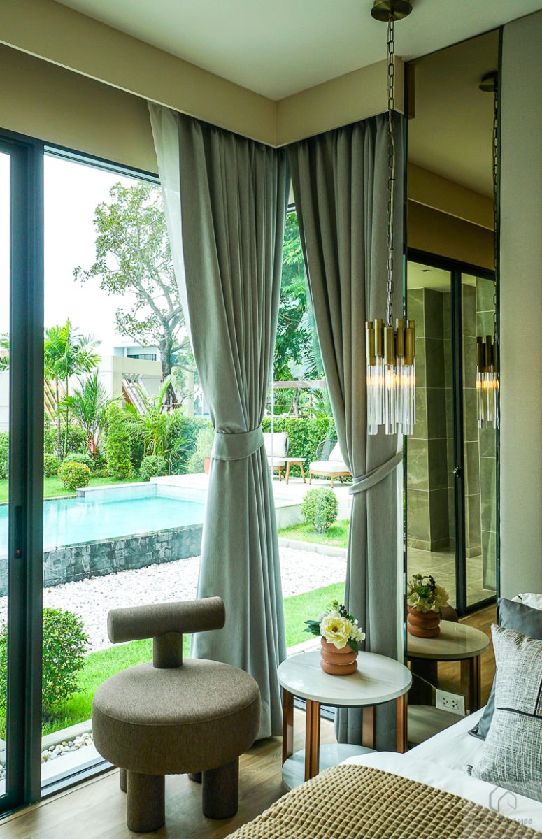 จากห้องนอน 4 จะมีประตูกระจกบานเลื่อนเปิดเชื่อมออกไปยังพื้นที่หลังบ้านได้ และมีกระจกเข้ามุมขนาดใหญ่ ทำให้แสงส่องเข้ามาในห้องได้เยอะ และยังเปิดรับวิวสระว่ายน้ำ วิวทะเลสาบอีกด้วย