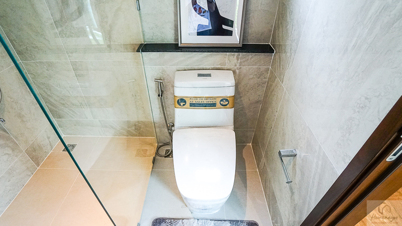 ด้านในเป็นพื้นที่ส่วนเปียกมีฉากกั้นอาบน้ำแบบบานเปิดให้ และติดตั้ง Hand Shower พร้อมเดินงานระบบไฟฟ้าติด Junction Box รองรับการติดตั้งเครื่องทำน้ำอุ่น พร้อมช่องสำหรับวางอุปกรณ์อาบน้ำ