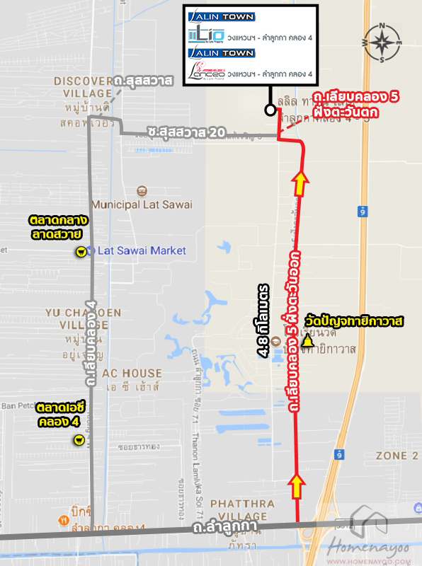การเดินทางเริ่ม ถ.กาญจนาภิเษกฯ (วงแหวนรอบนอกกรุงเทพฯ ฝั่งตะวันตก) ทางออก 4 ถ.ลำลูกกา ⇒ ถ.ลำลูกกา ⇒ กลับรถ (หน้า Thapp Line) ⇒ ถ.เลียบคลอง 5 ฝั่งตะวันออก ขับตรงไปประมาณ 1.3 กม. ถึงโครงการ ลลิลทาวน์ แลนซีโอ คริป วงแหวนฯ-ลำลูกกา คลอง 4 *ใกล้ซ.สุสวาส 20 หรือ ซ.แต้เจริญ 3)