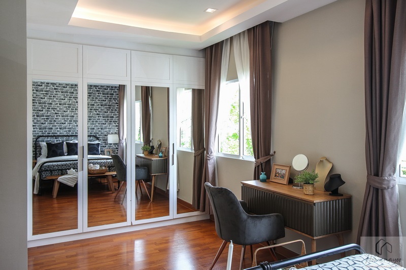 อีกฝั่งของห้องเป็นส่วนของ Walk in Closet โครงการบิวท์อินตู้เสื้อบานเปิด ความกว้างพอดีผนัง พร้อมจัดมุมโต๊ะเครื่องแป้ง ขนาดพอเหมาะให้ดูเป็นไอเดีย ผนังด้านข้างมีหน้าต่างกระจกบานเลื่อน ขนาด 1.2 x 1.1 เมตรให้ 1 บาน