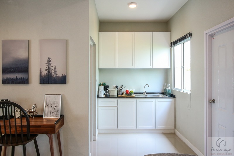 ถัดจากมุมทานอาหารเข้าไปอีกฝั่งเป็นห้องน้ำชั้นล่าง และ มุมครัว โดยบ้านตัวอย่างตกแต่งเป็นมุมอเนกประสงค์ สำหรับวางของมาให้ดูเป็นไอเดีย ส่วนบ้านมาตรฐานจะเป็นพื้นที่โล่ง มีหน้าต่างกระจกบานเลื่อน ขนาด 1.10 x 1.0 เมตร ให้ 1 บาน เปิดระบายอากาศ รับแสงธรรมชาติได้ดี พร้อมเดินงานระบบประปา-ไฟฟ้ารองรับการต่อเติมเอาไว้ให้พร้อมต่อใช้งาน
