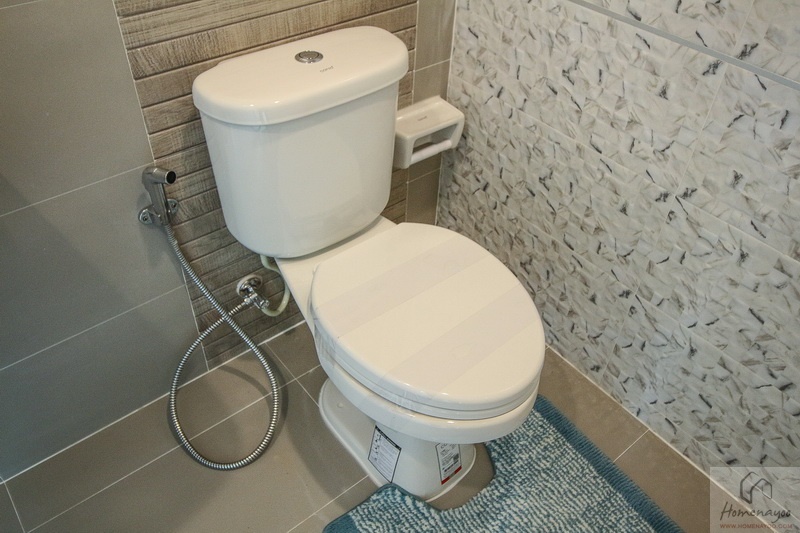 ห้องน้ำขนาดพอเหมาะ สุขภัณฑ์ภายในห้องน้ำของ Cotto ฟังก์ชันเหมือนกันกับแบบ Cher ทุกประการ บ้านจริงปูพื้นและผนังด้วยกระเบื้องเซรามิกสีอ่อน 30 x 30 ซม.
