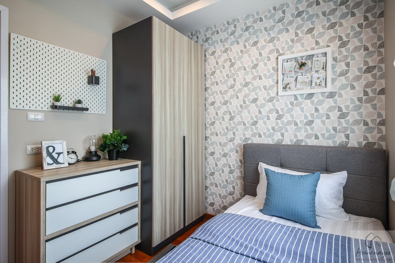 ข้างเตียงนอนมีพื้นที่เหลือพอให้วางตู้เสื้อผ้า และ ตู้เก็บของใบกลางเข้าไปได้