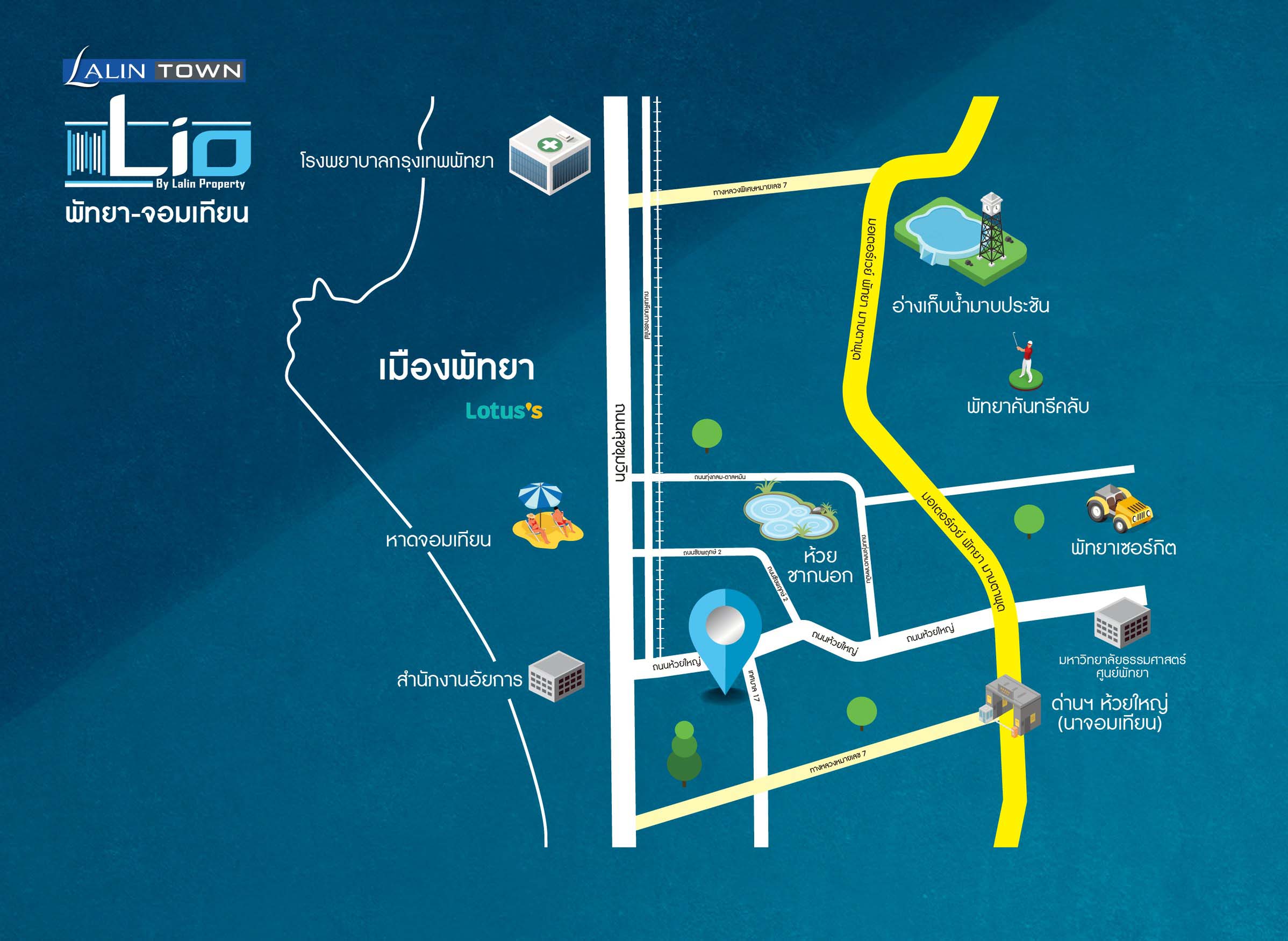 รายล้อมด้วยสถานที่สำคัญมากมาย เช่น Makro, Lotus’s, หาดจอมเทียน, รร.นานาชาติฝรั่งเศส, รพ.กรุงเทพ พัทยา, รพ.จอมเทียน, สำนักงานอัยการ, เทศบาลห้วยใหญ่ และศูนย์กีฬาแห่งชาติตะวันออก