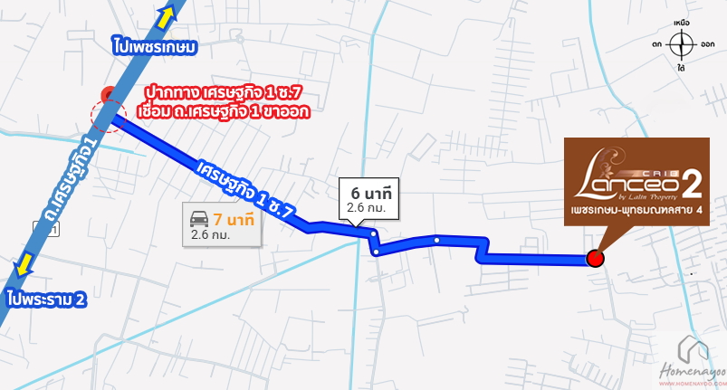 ภาพมุมสูงโครงการ Lanceo Crib เพชรเษม-พุทธมณฑลสาย 4 ตั้งอยู่ภายในสวนหลวง ซ.5 เลี้ยวซ้ายไปจะเชื่อมกับถนนสวนหลวง, ถนนพุทธสาคร และถนนเพชรเกษม หากเลี้ยวซ้ายจะเชื่อมกับเศรษฐกิจ 1 ซอย 7 ไปออกถนนเศรษฐกิจ 1 โซนของแหล่งงานอุตสาหกรรมของจังหวัดสมุทรสาครได้เลย