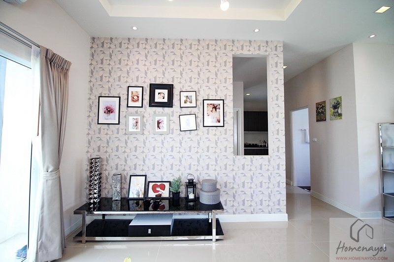 เข้าไปในบ้านส่วนแรกที่เจอคือห้องนั่งเล่น พื้นบ้านด้านในจะปูด้วยแกรนิตโต้ขนาด 60×60 ซม. จากตรงนี้จะเห็นไปถึงหลังบ้าน พื้นที่แต่ละส่วนกว้างขวาง สามารถวางเฟอร์นิเจอร์สำหรับ 4-5 คนได้สะดวก และมีหน้าต่างกระจกหลายมุมทำให้บ้านดูสว่างและโปร่ง