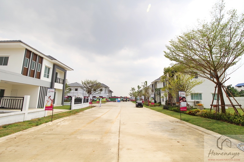 เข้ามาด้านในถนนหลักในโครงการจะกว้าง 12 ม. มีสวนและต้นไม้ริมทางให้ความร่มรื่น โซนแรกทางขวามือจะเป็นสำนักงานขายและบ้านตัวอย่าง