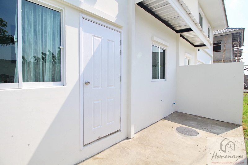 พื้นที่หลังบ้านกว้างขวางพอสำหรับทำเป็นส่วนซักล้าง มีที่ให้ตากเสื้อผ้าและวางเครื่องซักผ้าได้ บ้านจริงจะมีกำแพงกั้นแต่ละหลังให้มีพื้นที่เป็นสัดส่วนนะคะ