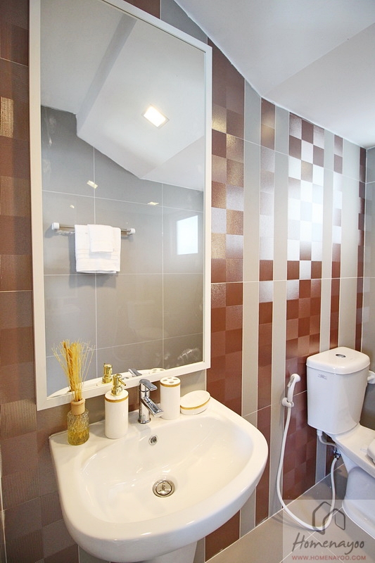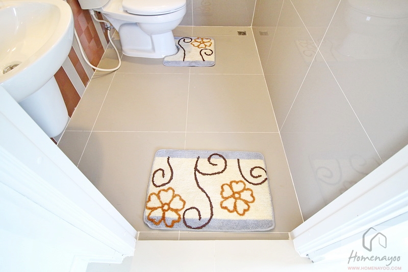 ผนังปูด้วยกระเบื้องสีขาวทำให้ห้องน้ำดูสะอาดตา ภายในมีหน้าต่างกระจกบานเล็กจึงมีแสงธรรมชาติส่องเข้ามา ห้องน้ำดูสว่างแม้ไม่ต้องเปิดไฟในตอนกลางวันและช่วยถ่ายเทอากาศได้ดี
