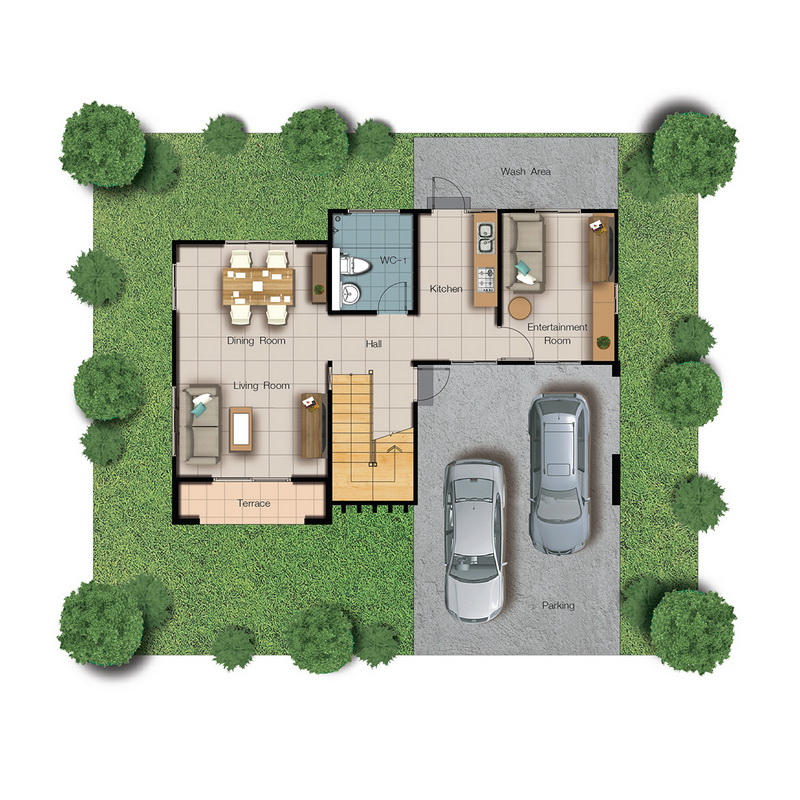 พื้นที่จอดรถทำหรับ 2 คัน ตรงนี้จะมีประตูที่เปิดเข้าไปในบ้านได้ด้วย ดังนั้นก็จะสะดวกเวลาฝนตกเพราะตรงจากพื้นที่จอดรถเข้าบ้านได้เลยไม่ต้องลุยฝน