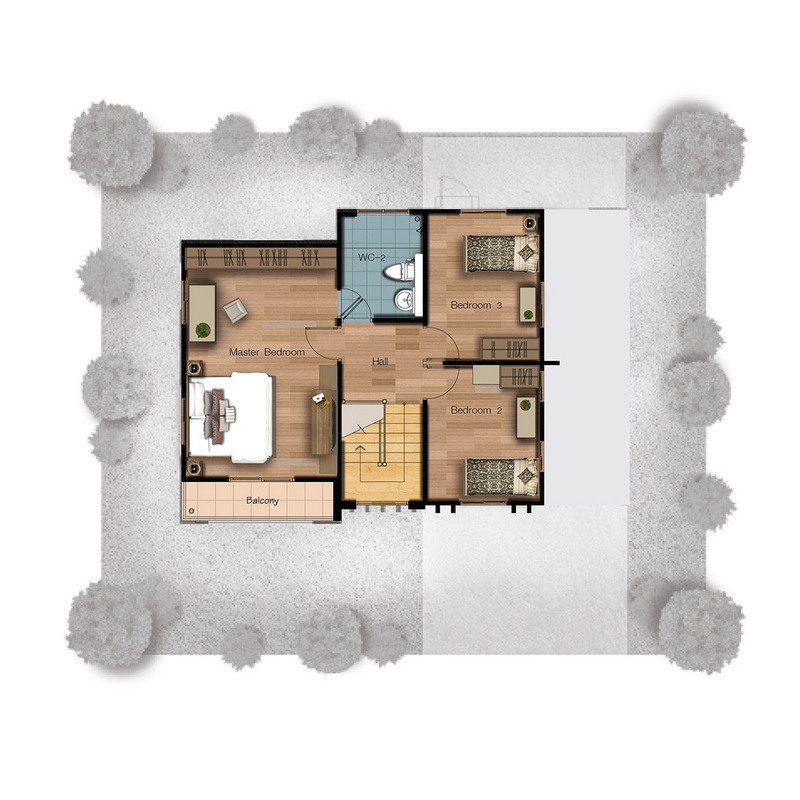 และชั้นบนเป็นห้องนอน 3 ห้องและห้องน้ำ 1 ห้อง ห้องนอนใหญ่หรือ Master Bedroom เป็นห้องที่มีพื้นที่ใช้สอยมากที่สุดโดยครอบคลุมพื้นที่ครึ่งหนึ่งของชั้นบน เป็นห้องส่วนด้านหน้าบ้านจึงมีหน้าต่างกระจกบานใหญ่ ทำให้ห้องดูสว่างและโปร่ง สำหรับห้องนอน 2-3 ขนาดพื้นที่ใช้สอยใกล้เคียงกัน สามารถวางเตียง 3.5 ฟุตพร้อมตู้เสื้อผ้า โต๊ะเครื่องแป้งหรือโต๊ะทำงาน