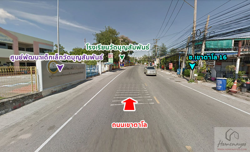 จากนั้นระยะทางอีก 1.5 กิโลเมตร ผ่านซ้ายมือ ศูนย์พัฒนาเด็กเล็กวัดบุญสัมพันธ์, โรงเรียนวัดบุญสัมพันธ์, ด้านขวามือจะเป็น ซอยเขาตาโล 16