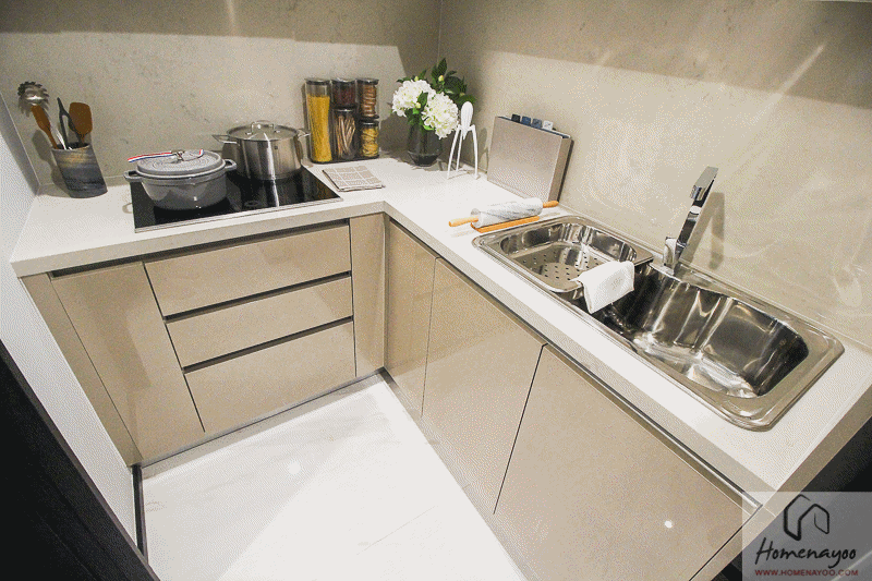 เคาน์เตอร์ตัวล่างแบ่งเป็นตู้เก็บของและลิ้นชักพร้อมช่องแบ่งเก็บ ช้อน/ส้อม มีพื้นที่ให้ยืนเตรียมอาหารพอดีๆ
