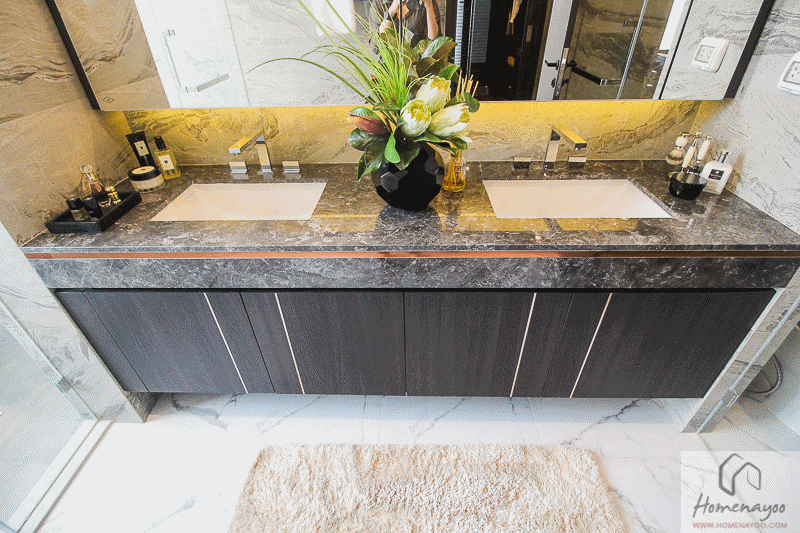 โดยได้อ่างล้างมือ Built – In ยี่ห้อ Villeroy & Boch มีติดตั้งเครื่องทำน้ำร้อนมาให้พร้อมใช้งาน ท็อปเคาน์เตอร์วัสดุเป็นหินอ่อน Black Emperador ก๊อกน้ำยี่ห้อ Gessi พร้อมเต้าเสียบปลั๊กไฟและฝาครอบกันน้ำ เผื่อใครชอบเป่าผมในห้องน้ำ หรือใช้แปรงสีฟันไฟฟ้าก็สามารถใช้งานได้สะดวก