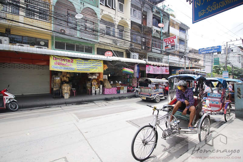 เรามาเดินสำรวจบริเวณโดยรอบโครงการกันค่ะ ว่าจะมีบรรยากาศเป็นอย่างไรบ้าง เริ่มจากที่หน้าโครงการ จะติดกับถนนซอยวัดด่านสำโรง ส่วนฝั่งตรงข้ามคืออาคารพาณิชย์สูง 3 ชั้นครึ่ง มีทั้งร้านอาหารตามสั่ง, ร้านของของชำ และร้านตัดผม