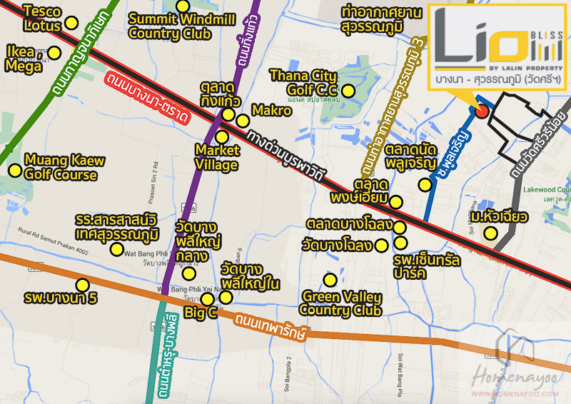 ทำเลที่ตั้งโครงการ – Lio Bliss บางนา-สุวรรณภูมิ อยู่ในจังหวัดสมุทรปราการ ตั้งอยู่ในซอยพูลเจริญ รอบๆ โครงการส่วนใหญ่เป็นพื้นที่ว่างเปล่าและบ้านพักอาศัย ความอุดมสมบูรณ์จะไม่คึกคักมากนักจะออกแนวชุมชน ส่วนใหญ่จะเป็นร้านค้า ร้านโชห่วย ตลาดนัดตลาดสด มีร้านสะดวกซื้ออยู่ช่วงเกือบๆต้นซอย ส่วนห้างสรรพสินค้าใกล้ๆ ตรงเส้นบางนาตราดมี Market Village ภายในมี Tesco Lotus , Home Pro ฝั่งตรงข้ามมี Makro และตลาดกิ่งแก้ว หรือย้อนเข้าเมืองไปมี Mega และ Ikea บางนา ตรงเส้นเทพารักษ์มี Big C