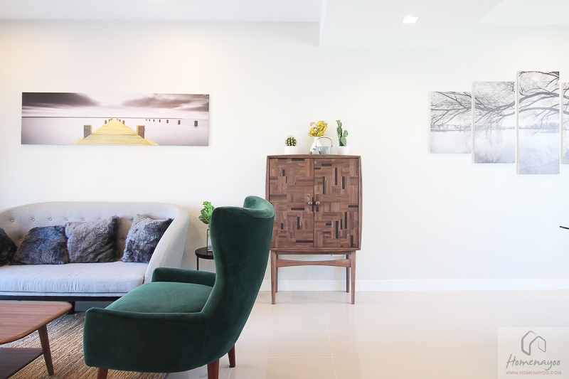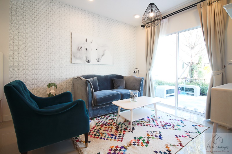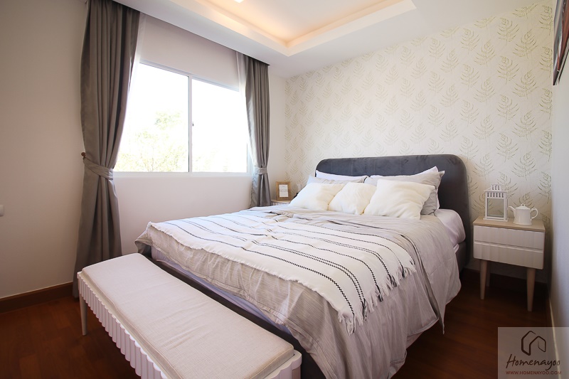 ทางโครงการตกแต่งห้องนี้เป็นห้องนั่งเล่นมาให้ดูเป็นไอเดียค่ะ ถ้าจะจัดเป็นห้องนอน เราสามารถดันเตียงชิดผนังฝั่งริมหน้าต่างได้เลย