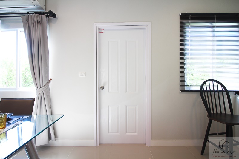 ประตูทางเข้าบ้านเป็นประตูบานเลื่อนกรอบอลูมิเนียมสีขาว ติดกระจกเขียวตัดแสง และติดมือจับประตูแบบเซาะร่องมาตรฐานใช้กุญแจไข ข้างประตูบ้านติดไฟกิ่งให้ทั้ง 2 ฝั่ง ส่วนพื้นภายในบ้านจะยกระดับขึ้นไปอีก 10 ซม.