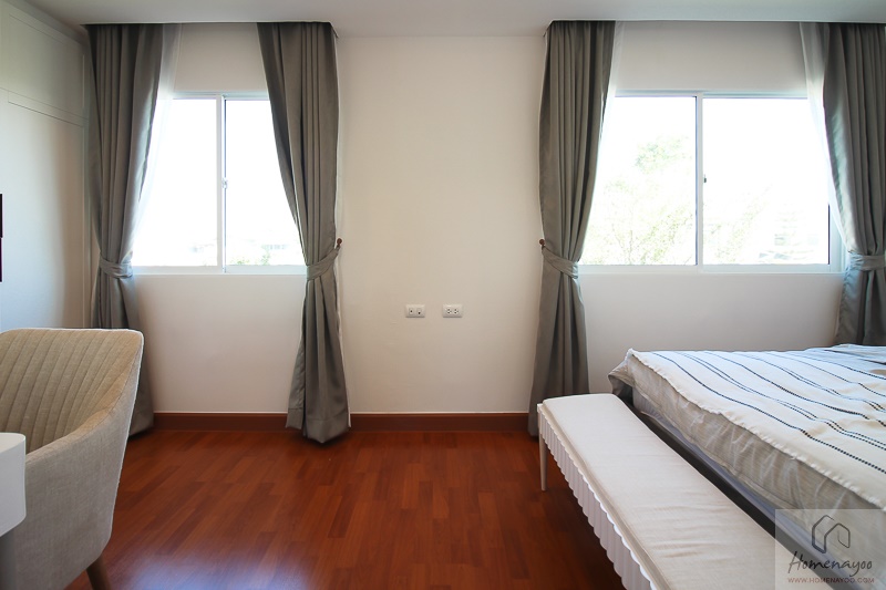 ขนาดพื้นที่ห้องสามารถรองรับเตียงนอนขนาด 5 – 6 ฟุตได้สบายๆ เลย และยังเหลือนที่ฝั่งละ 50 ซม. สามารถเดินเข้า – ออกได้อย่างสะดวก บริเวณหัวเตียงสามารถวางโคมไฟตั้งพื้น หรือโต๊ะข้างขนาดกะทัดรัดเพิ่มเติมได้ และปลายเตียงนอนยังสามารถวางสตูลขนาดใหญ่ได้อีกด้วย