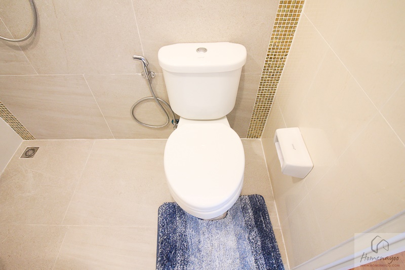 ถัดจากอ่างล้างมือจะเป็นโถสุขภัณฑ์ ใช้ระบบ Dual Flush พื้นที่โถสุขภัณฑ์กว้าง 90 ซม. ลองนั่งดูแล้วกว้างกำลังดีไม่อึดอัดค่ะ ติดตั้งอุปกรณ์มาตรฐาน สายชำระ+ที่แขวนกระดาษทิชชู่ ไว้ให้ครบชุด