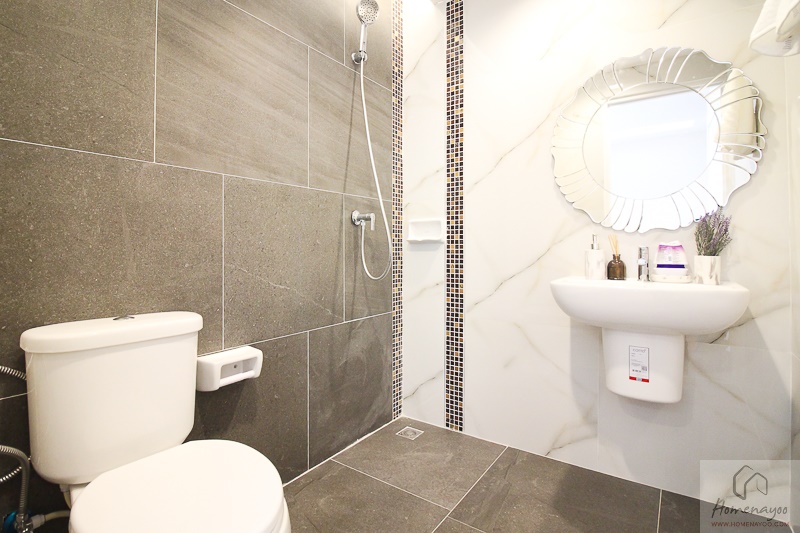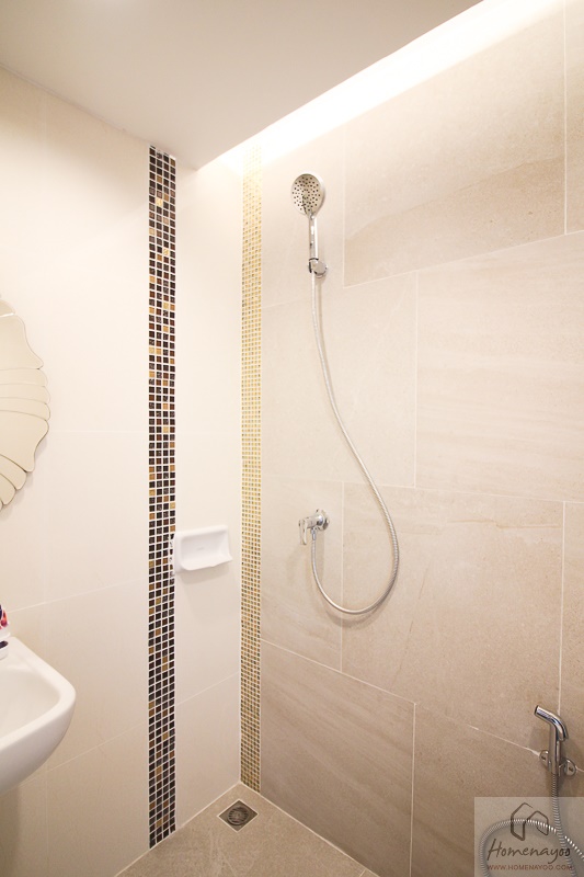 ส่วนพื้นที่ยืนอาบน้ำจะมีขนาดที่กว้างมากขึ้น สะดวกกว่าห้องน้ำชั้นล่าง