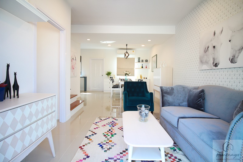 เปิดประตูเข้ามาด้านในจะเป็นส่วนห้องนั่งเล่น ถัดเข้าไปคือห้องรับประทานอาหาร จัดแปลนบ้านแบบ Open plan บ้านดูโปร่งโล่ง บ้านตัวอย่างจัดเฟอร์นิเจอร์และ Finishing มาให้เห็นความลงตัวในแง่ของการใช้งานและความสวยงามเพื่อเป็นไอเดียค่ะ ที่พื้นบ้านปูด้วยกระเบื้องแกรนิตโต้ 60 x 60 ซม. พร้อมบัวพื้นสีขาว ผนังเป็นผนังฉาบเรียบทาสี ฝ้าเพดานภายในบ้านสูง 2.7 เมตร เป็นฝ้าฉาบเรียบ พร้อมติดดวงโคมซาลาเปาให้ทั้งหลัง