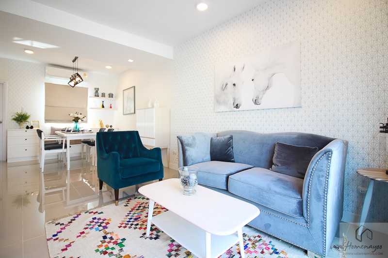 ระยะห่างชุดโซฟา – ชั้นวางทีวี ประมาณ 2.0 เมตร ระยะนี้หมาะสำหรับดูทีวีจอขนาด 50 นิ้วจะกำลังพอดีค่ะ เห็นระยะเหลือเป็นทางเดินเข้า – ออกไปส่วนอื่นๆ ได้สะดวกอยู่