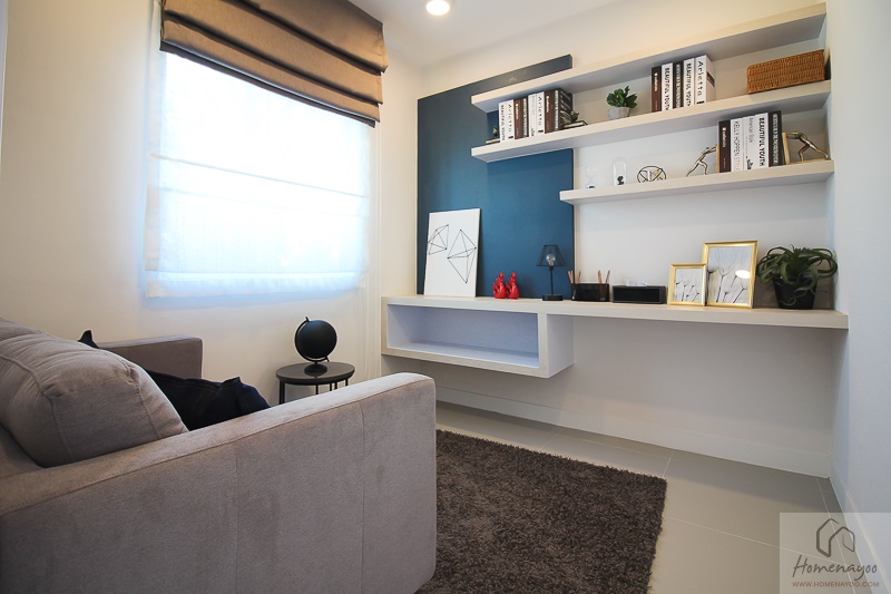 ห้องนอน 3 ขนาดพื้นที่ภายในห้องนั้นแทบไม่ต่างจากห้องนอน 2 เลย โดยบ้านตัวอย่างตกแต่งเป็นห้องสำหรับนั่งทำงานและห้องนั่งอ่านหนังสือ ซึ่งจริงๆ แล้วห้องนี้ก็มีขนาดใหญ่พอสำหรับวางเฟอร์นิเจอร์เพื่อเป็นห้องนอนได้ค่ะ
