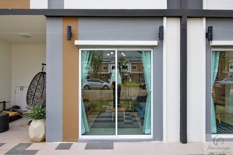 ประตูทางเข้าบ้านเป็นประตูบานเลื่อนอลูมิเนียมสีขาวกระจกเขียวตัดแสง ติดตั้งไฟกิ่งด้านบน 2 ดวงเหนือประตูทางเข้าบ้านด้านซ้ายและขวา