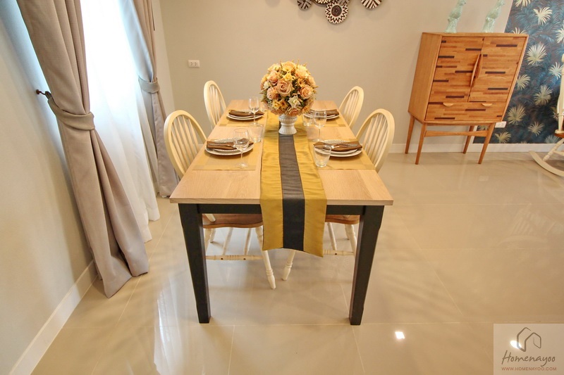 โต๊ะทานอาหารวางขนาด 4 ที่นั่งเป็นตัวอย่าง ซึ่งกำลังพอดีกับแบบบ้าน 3 ห้องนอนที่มีจำนวนสมาชิก 3-4 คน