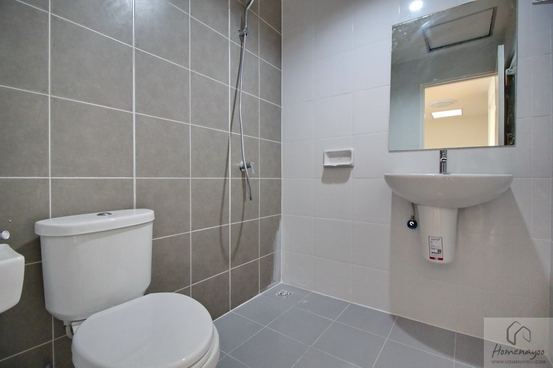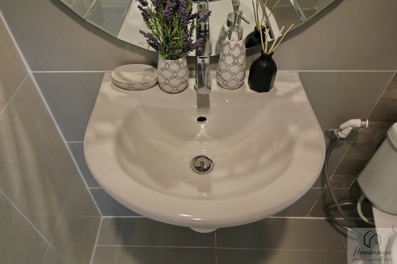 อ่างล้างหน้าแบบแขวนผนัง พร้อมติดตั้งบานกระจกเงาให้ แต่จะเป็นทรงสี่เหลี่ยมมาตรฐาน ใกล้กันติดตั้งราวแขวนผ้าให้ด้วย