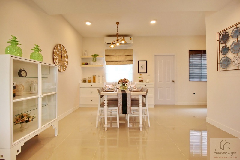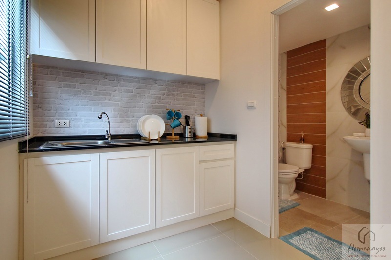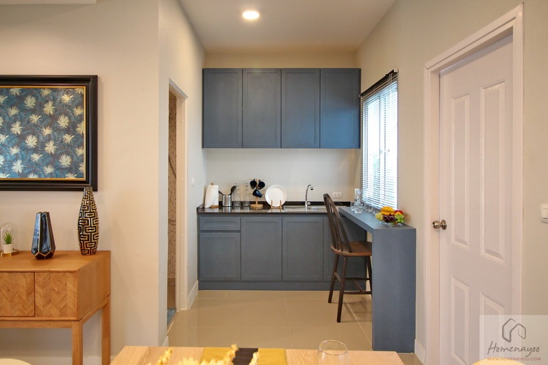 บ้านตัวอย่างบิวท์อินเคาน์เตอร์ครัว และโต๊ะสไตล์เคาน์เตอร์บาร์ที่มีความต่อเนื่องกันเข้ามุมให้ดูเป็นไอเดีย ส่วนบ้านมาตรฐานจะเป็นพื้นที่โล่ง มีการเดินงานระบบประปาไฟฟ้ารองรับการต่อเติมเอาไว้ให้พร้อมต่อใช้งาน ด้านหลังบ้านมีหน้าต่างให้แสงสว่างที่สามารถเปิดปิดได้แบบบานสไลด์