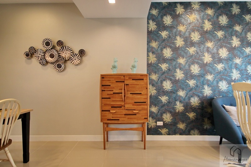 มุมมองย้อนกลับไปยังฝั่งประตูทางเข้าบ้าน ให้เห็นพื้นที่ทางเดินหลังจากที่วางเฟอร์นิเจอร์ครบแล้ว ยังเหลือช่องทางเดินหน้าทีวีเพื่อให้เข้าออกบ้านได้สะดวก