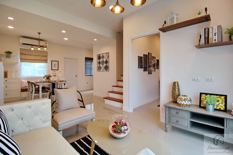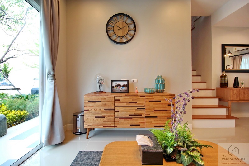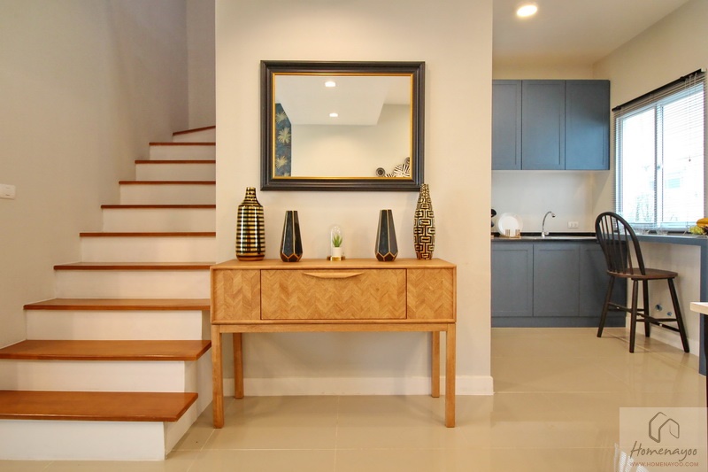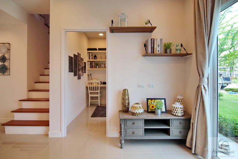 เช่นเดียวกันกับพื้นที่ด้านข้างบันไดตรงนี้ เหลือพื้นที่ใช้งานได้อีกพอสมควร โดยทางโครงการลองวางโต๊ะอเนกประสงค์ให้ดู หากบิวท์อินเป็นโต๊ะทำงานสวยๆ ผมว่าเป็นมุมหนึ่งที่น่าใช้งานทีเดียว