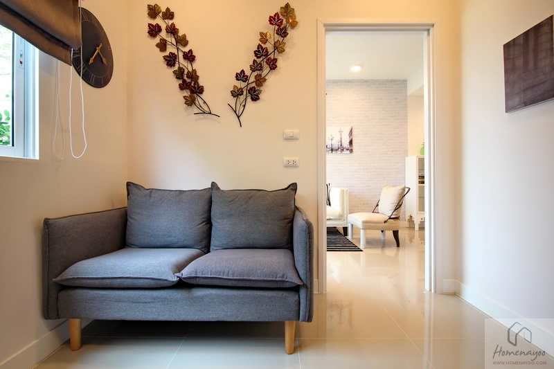 มุมพักผ่อนทางโครงการจัดวางโซฟาขนาดกลาง พร้อมโต๊ะกลมด้านข้างให้ดูเป็นไอเดีย บ้านจริงปรับเปลี่ยนเป็นโซฟาตัว L ก็ได้