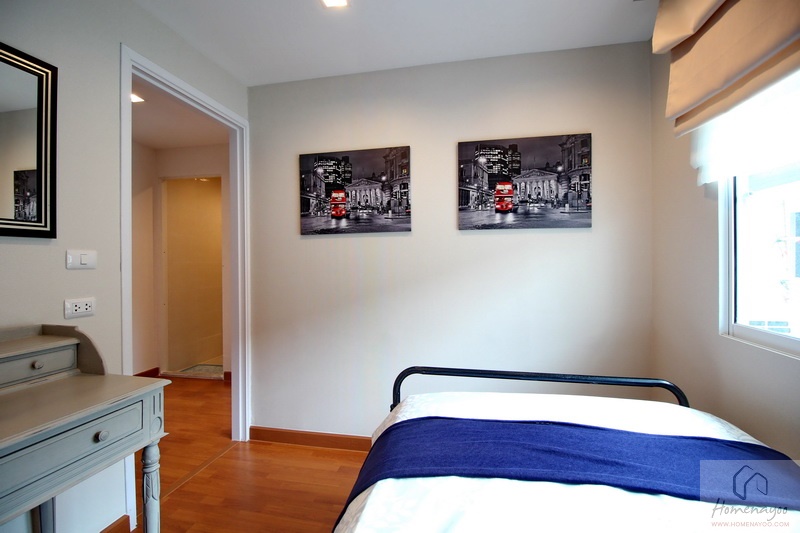 ห้องนี้ทางโครงการวางเตียงนอนขนาด 3.5 ฟุตให้ดูเป็นตัวอย่าง ซึ่งเป็นขนาดเตียงที่เหมาะสมกับขนาดของห้อง ด้านหลังบ้านมีหน้าต่างบานเลื่อน 1 บานให้แสงสว่าง