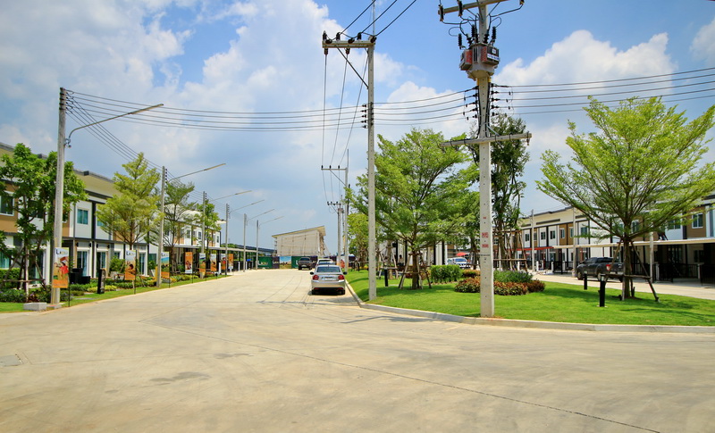มองไปทางซ้ายมือเป็นถนนเมนทางเข้า, สำนักงานขาย และ บ้านตัวอย่าง