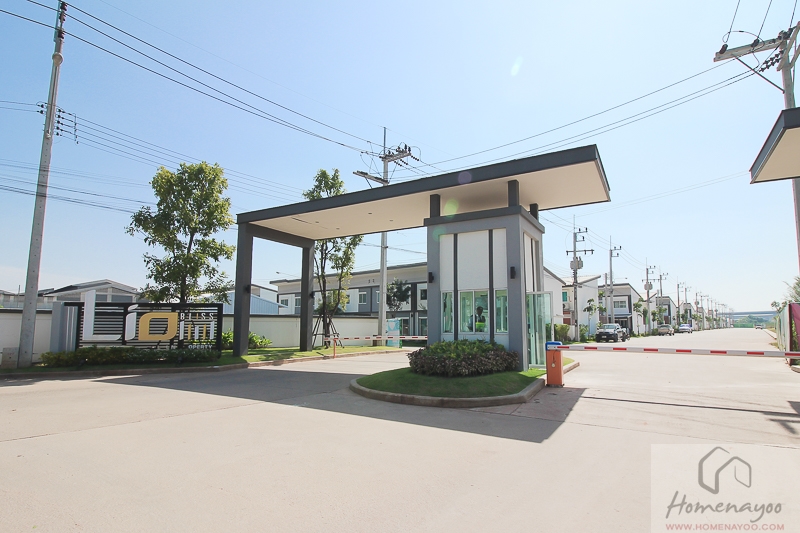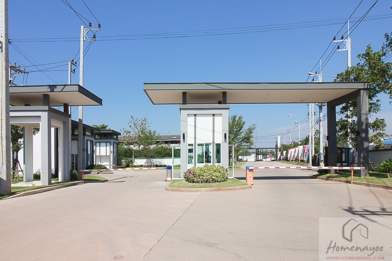 เราได้ชมรายละเอียดกันไปแล้ว ตอนนี้เราจะพาท่านผู้อ่านเดินชมภาพบรรยากาศจริงของโครงการกันบ้าง และนี่ก็คือซุ้มทางเข้าโครงการที่อยู่ติดถ.บางปลาค่ะ ตรงนี้จะเป็นแค่ซุ้มธรรมดา ไม่ได้มีระบบรักษาความปลอดภัยประกอบ