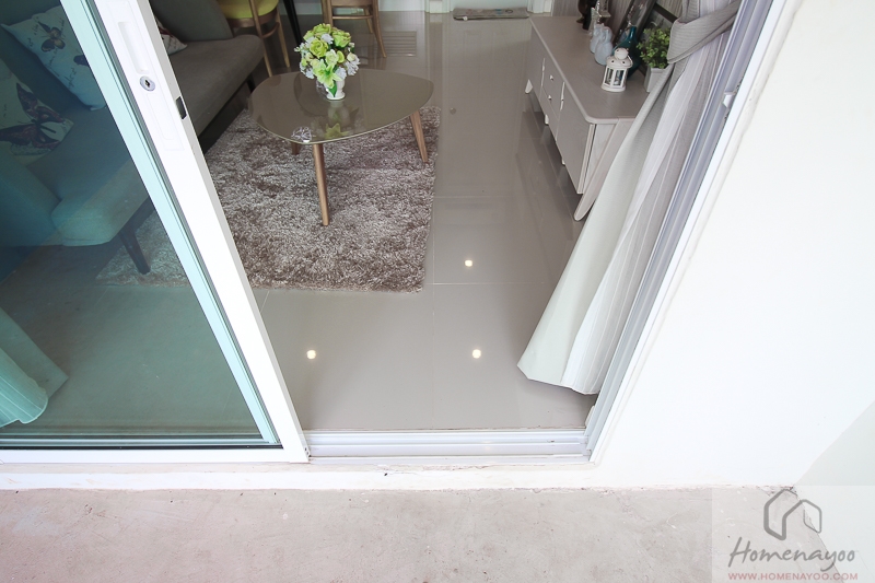 บริเวณเฉลียงทางเข้าบ้านจะเป็นพื้นซีเมนต์ปาดเรียบทำเสมอกับพื้นโรงจอดรถค่ะ ประตูทางเข้าบ้านเป็นประตูบานเลื่อนอลูมิเนียมสีขาว ติดกระจกเขียวตัดแสง มือจับและตัวล็อคประตูแบบเซาะร่องมาตรฐาน