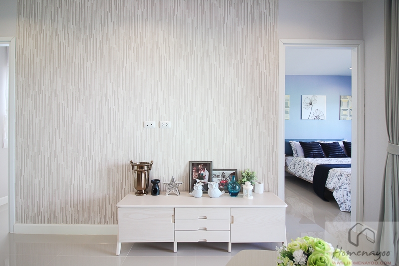 เปิดประตูเข้ามาด้านในจะเป็นส่วนห้องนั่งเล่น ถัดเข้าไปคือห้องทานอาหาร จัดแปลนบ้านแบบ Open Plan ทำให้บ้านดูโปร่งโล่ง บ้านตกแต่งจัดเฟอร์นิเจอร์และ Finishing มาให้เห็นความลงตัวในแง่ของการใช้งานและความสวยงามเพื่อเป็นไอเดียค่ะ พื้นบ้านปูด้วยกระเบื้องแกรนิตโต้ 60 x 60 ซม. พร้อมบัวพื้นสีขาว ผนังเป็นผนังฉาบเรียบทาสี