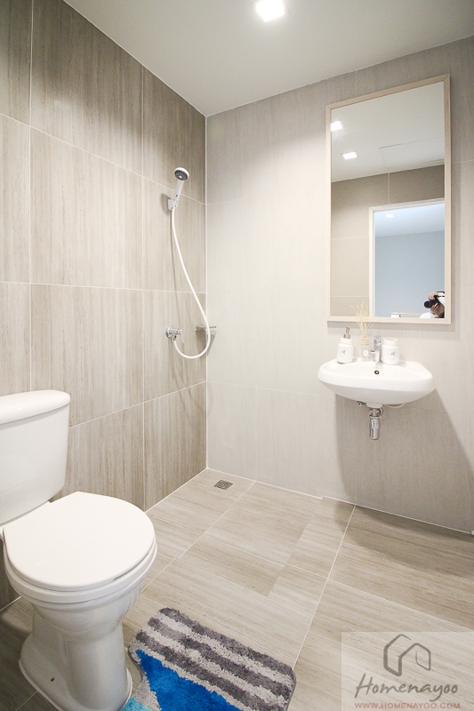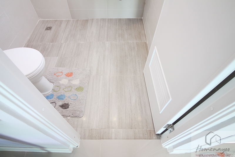 ทั้งวัสดุและสุขภัณฑ์ภายในห้องน้ำจะไม่ต่างจากบ้านหลังที่แล้วค่ะ แต่ขนาดห้องน้ำชั้นล่างนี้จะมีขนาดที่เล็กกว่าหน่อย และไม่มีหน้าต่างระบายอากาศให้