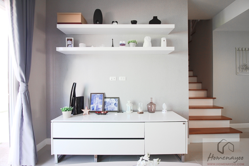 ฝั่งชั้นวางทีวีผนังจะเว้าเข้ามาเพราะด้านนอกเป็นที่จอดรถ ทำให้เราได้พื้นที่วางตู้วางทีวีพอดีเลย ส่วนระยะดูทีวียังหลือ 1.6 เมตร เป็นระยะที่เหมาะสำหรับการนั่งดูทีวีขนาด 42-47 นิ้วค่ะ