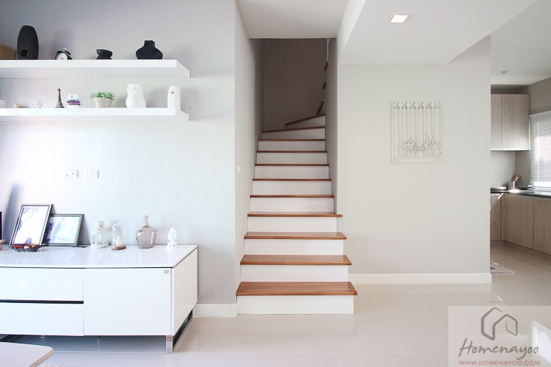 กลับเข้ามาภายในบ้าน เราจะขึ้นไปดูที่ชั้น 2 กันต่อค่ะ ตัวโถงบันไดจะกว้าง 90 ซม.ได้ระยะมาตรฐานพอดี ผนังด้านข้างยังเหลือพื้นที่สามารถทำชั้น Built – in วางของใช้หรือวางของตกแต่งบ้านเพิ่มได้อีกนะ