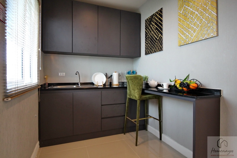 ส่วนนี้ทางโครงการจัดเตรียมให้ดูเหมือนเป็นมุม Pantry มากกว่าที่จะเรียกว่าห้องครัวครับ โดยบิวท์อินเป็นแนวเคาน์เตอร์รูปตัว L ด้านในใช้เป็นมุมล้างจาน และแนวทางซ้ายเป็นเคาน์เตอร์สำหรับจิบชาหรือเตรียมอาหาร เนื่องจากความเป็นจริงลูกบ้านส่วนใหญ่มักจะไปต่อเติมห้องครัวไทยกันเอาไว้ที่ลานซักล้างด้านหลัง เพื่อให้สามารถประกอบอาหารหนักได้อย่างเต็มที่